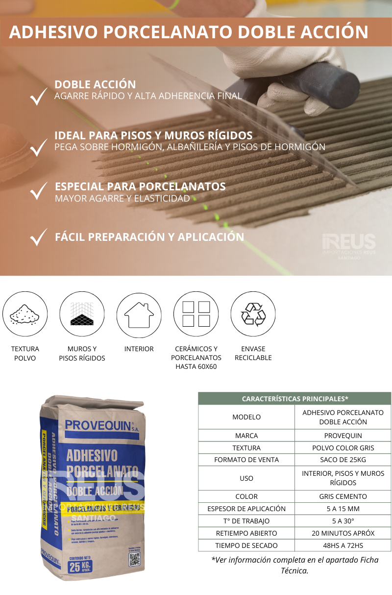 Adhesivo Porcelanato DOBLE ACCIÓN 25Kg - PROVEQUIN (Weber)