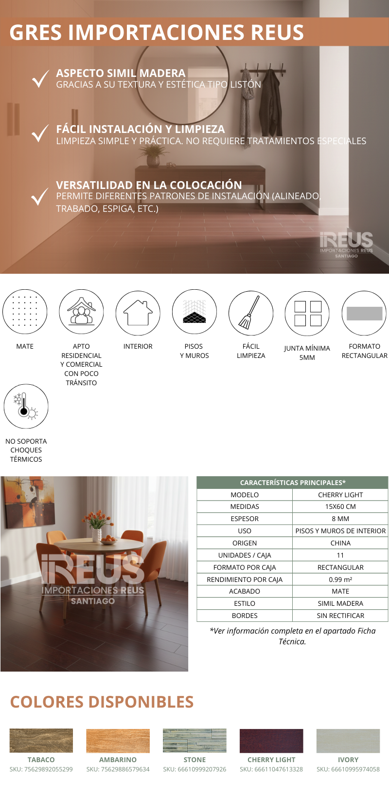 Gres 15x60cm - $7.990xm² - Cherry Light Stock por sucursal Stock por sucursal $ 7.910 cantidad Agregar al carro Encargar Imágenes referenciales: los colores pueden variar según la configuración de cada pantalla.