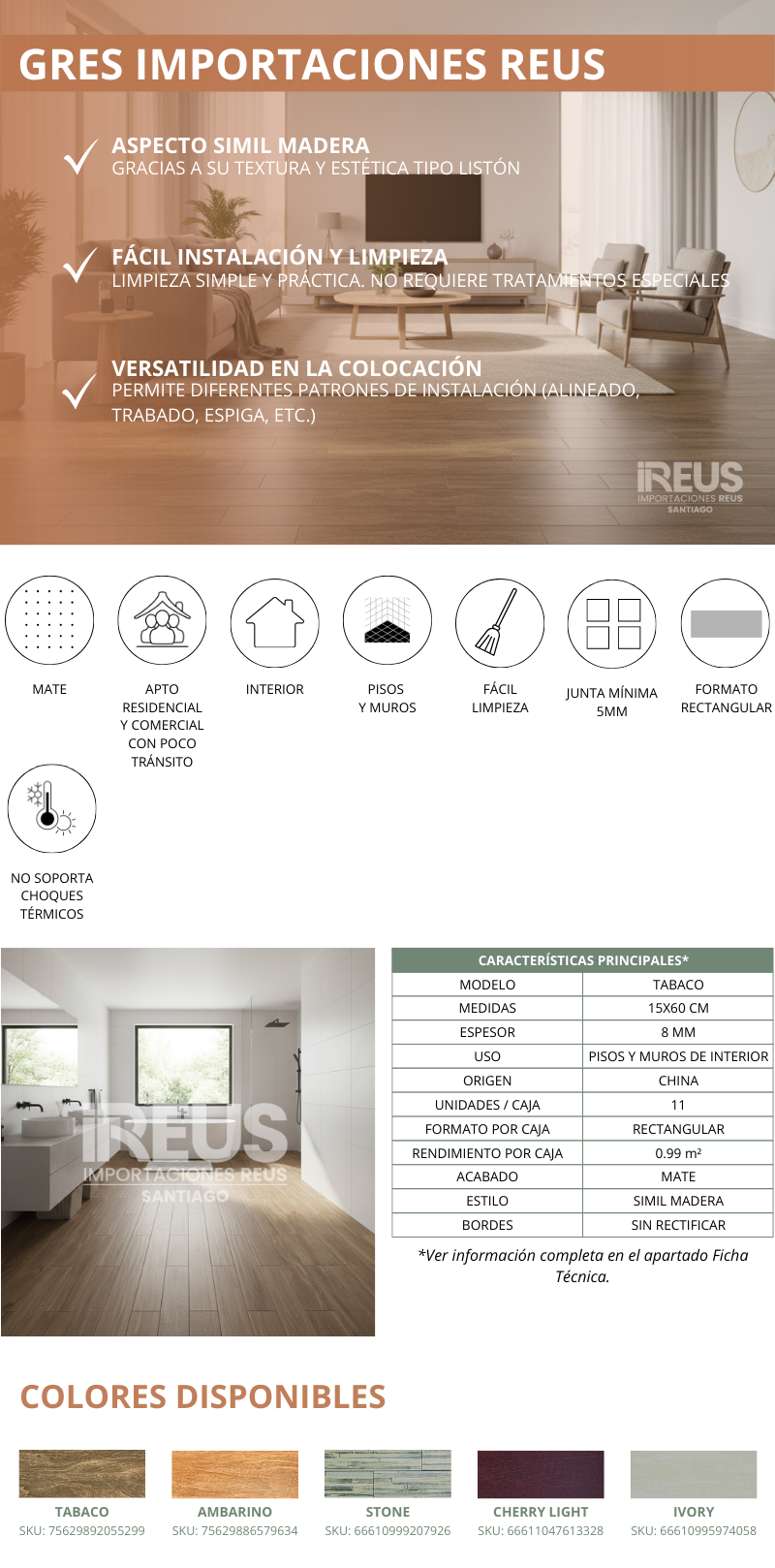 GRES 15x60cm $8.990xm² - Tabaco Stock por sucursal Stock por sucursal $ 8.900 cantidad Agregar al carro Encargar Imágenes referenciales: los colores pueden variar según la configuración de cada pantalla.