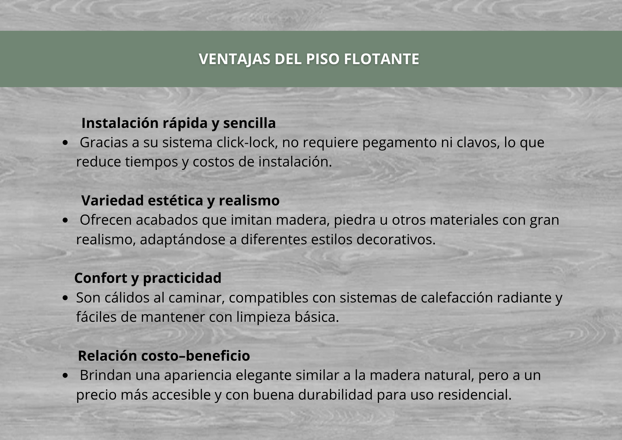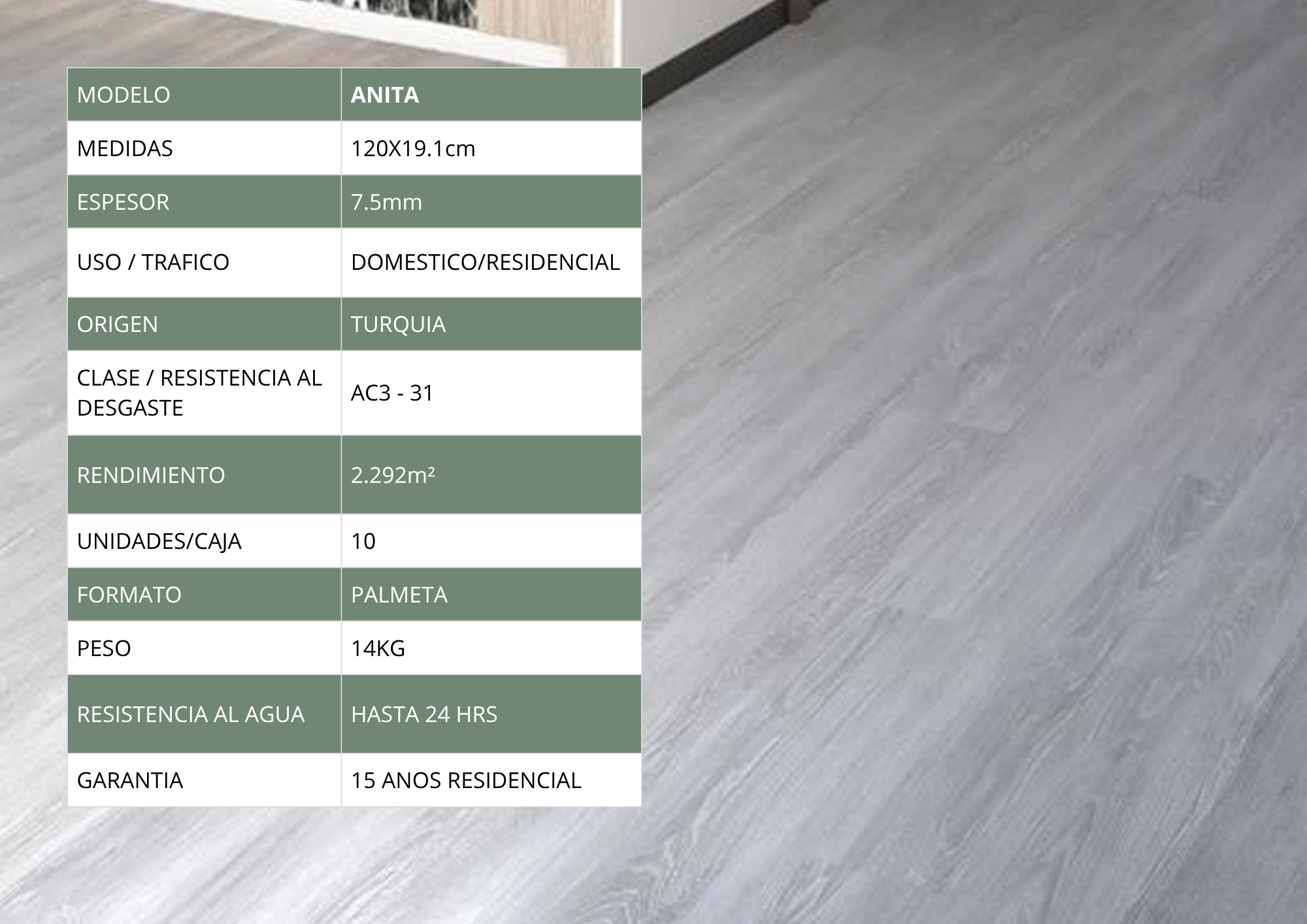 Piso Flotante 120x19.1cm $7.986 xm² c/iva - Anita Stock por sucursal Stock por sucursal $ 18.305 Modelo Escoge Modelo Sin Biselado Formato Escoge Formato 19.1x120 Origen Escoge Origen Turquía Espesor Escoge Espesor 7.5mm cantidad Agregar al carro Encargar Imágenes referenciales, los colores pueden variar según la configuración de cada pantalla.