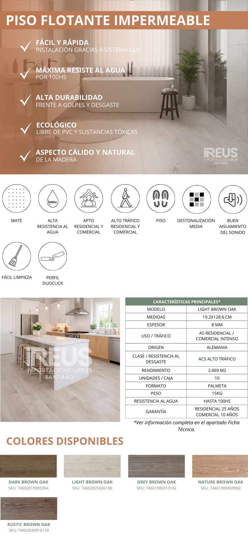 Piso Flotante Impermeable 19.2x128.6cm $15.490xm²- LIGHT BROWN OAK