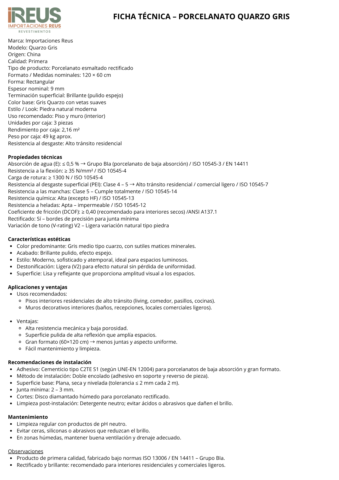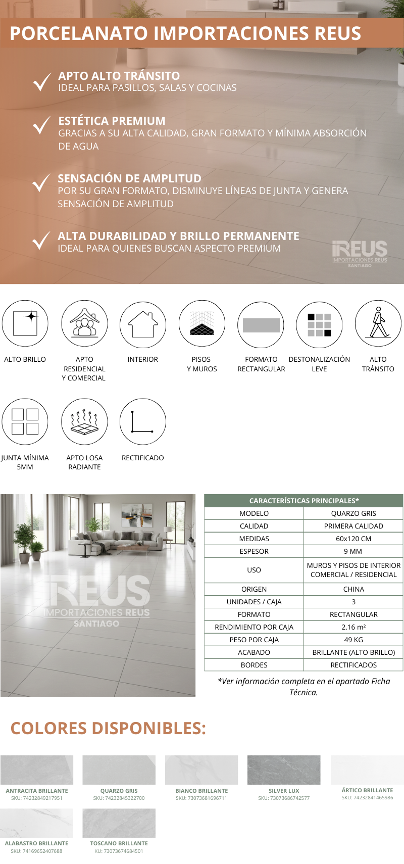 Porcelanato 60X120cm $13.990xm² - Quarzo Gris Stock por sucursal Stock por sucursal $ 30.218 cantidad Agregar al carro Encargar Imágenes referenciales: los colores pueden variar según la configuración de cada pantalla.