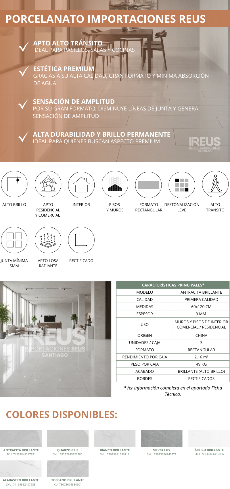 Porcelanato Brillante 60X120cm - $13.990xm² - Antracita Brillante