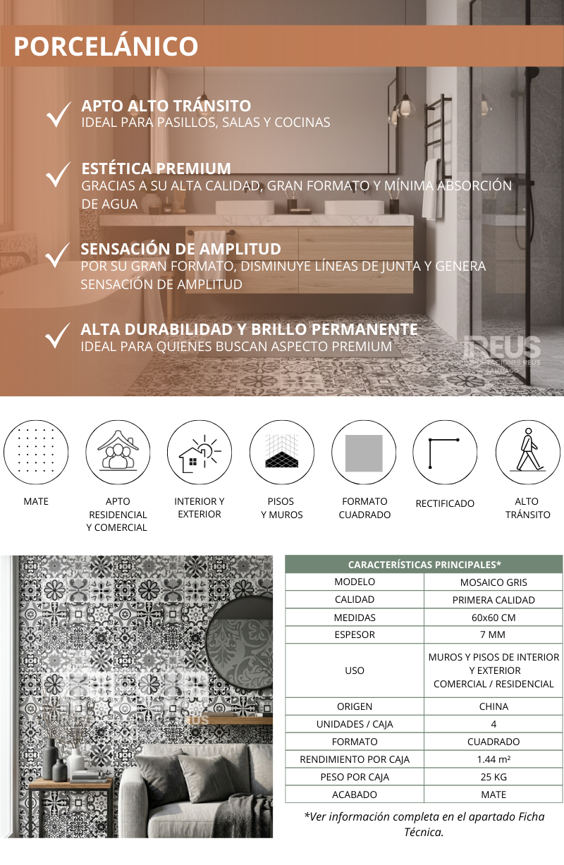 PORCELÁNICO 60X60cm $8.990xm² - MOSAICO GRIS Stock por sucursal Stock por sucursal $ 12.946 cantidad Agregar al carro Encargar Imágenes referenciales: los colores pueden variar según la configuración de cada pantalla.