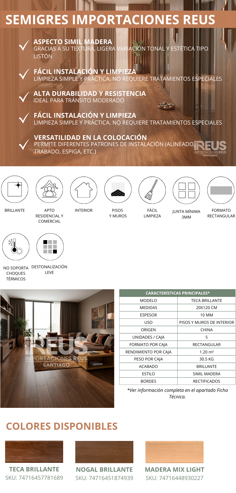 Semigres 20X120cm $10.493xm² - Teca Brillante Stock por sucursal Stock por sucursal $ 12.591 cantidad Agregar al carro Encargar Imágenes referenciales: los colores pueden variar según la configuración de cada pantalla.