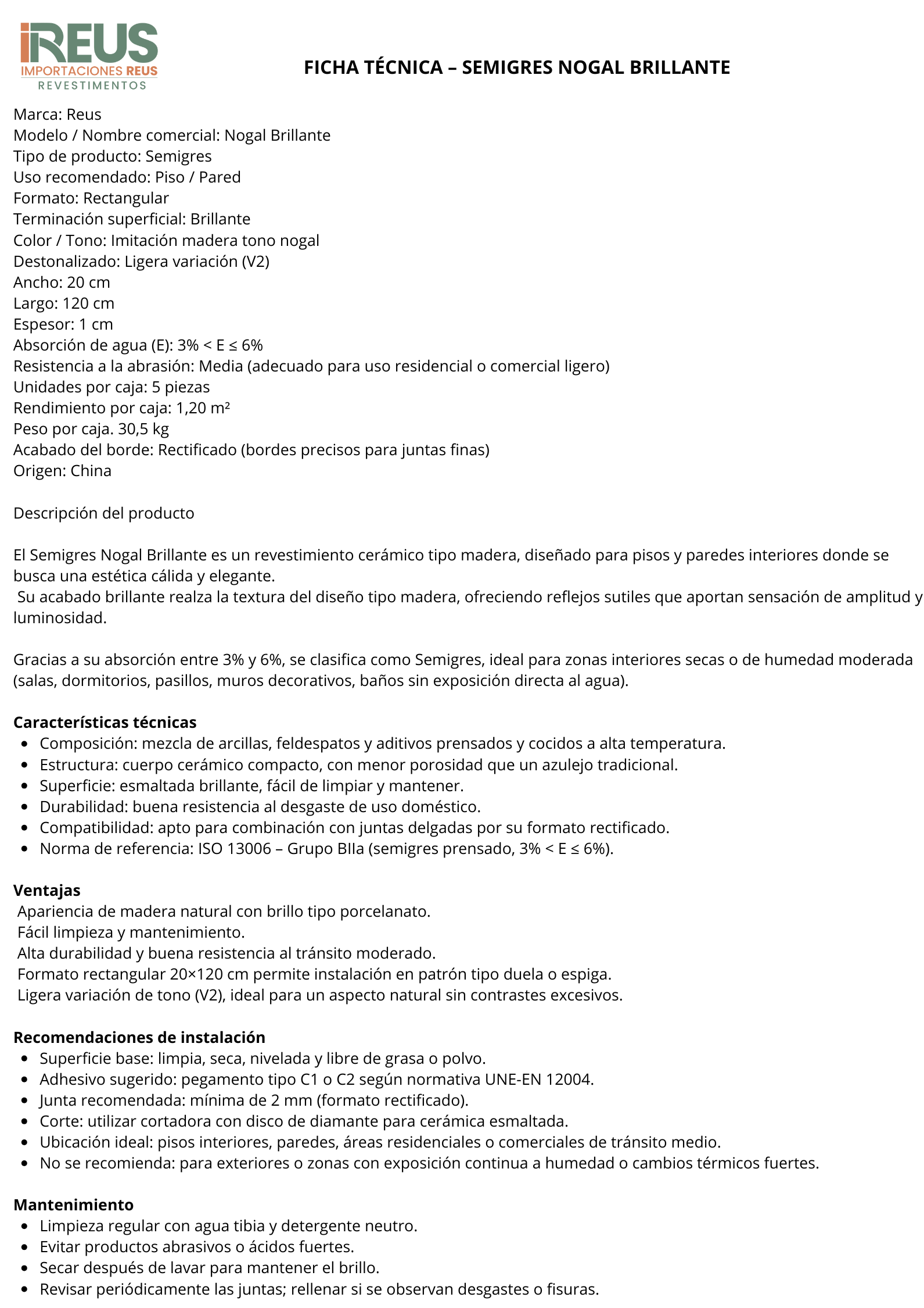 SEMIGRES 20X120cm $11.273 xm² - NOGAL BRILLANTE Stock por sucursal Stock por sucursal $ 13.528 Estilo Escoge Estilo Madera Formato Escoge Formato 20X120 Textura Escoge Textura Brillante cantidad Agregar al carro Encargar